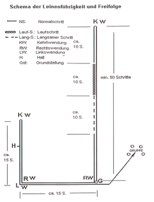 A) Begleithundprüfung auf einem Übungsplatz Gesamtpunktzahl 60 Jede Einzelübung beginnt und endet mit der Grundstellung. Der Hund sitzt auf der linken Seite gerade neben seinem HF mit dem rechten Schulterblatt in Kniehöhe. Das Einnehmen der Grundstellung ist zu Beginn jeder Übung nur einmal erlaubt. In der Grundstellung steht der HF in sportlicher Haltung. Eine Grätschstellung ist nicht erlaubt. Die Endgrundstellung der vorhergehenden Übung kann als Ausgangsgrundstellung der folgenden Übung verwendet werden. Körperhilfen des HF sind nicht gestattet, werden sie angewandt, erfolgt Punktabzug. Das Mitführen von Triebmitteln oder Spielgegenständen ist nicht gestattet. Kann ein HF aufgrund körperlicher Behinderung einen Übungsteil nicht korrekt ausführen, so hat er dieses vor Beginn der Prüfung dem LR mitzuteilen. Lässt eine Behinderung des HF das Führen des Hundes an der linken Seite des HF nicht zu, so darf der Hund analog an der rechten Seite geführt werden. Der LR gibt die Anweisung zu Beginn einer Übung. Alles weitere, wie Wendungen, Halt, Wechseln der Gangart usw. wird ohne Anweisung des LR ausgeführt. Es ist jedoch dem HF gestattet, diese Anweisungen vom LR zu erfragen. Das Loben des Hundes ist nach jeder beendeten Übung erlaubt. Danach kann der Hundeführer eine neue Grundstellung einnehmen. Zwischen Lob und Neubeginn ist ein deutlicher Zeitabstand (ca. 3 Sekunden) einzuhalten. Zwischen den Übungen muss der Hund bei Fuß geführt werden. 1. Leinenführigkeit (15 Punkte) Hörzeichen »Fuß« Von der Grundstellung aus hat der am tierschutzgerechten handelsüblichen Halsband oder Brustgeschirr angeleinte Hund seinem HF auf das Hörzeichen »Fuß« freudig zu folgen. Das Halsband darf nicht auf Zug gestellt sein. Zu Beginn der Übung hat der HF mit seinem Hund 40 bis 50 Schritt geradeaus zu gehen, ohne zu halten, eine Kehrtwendung zu machen und nach 10 bis 15 Schritt den Laufschritt und den langsamen Schritt zu zeigen, mindestens jeweils 10 Schritte. In der normalen Gangart sind dann mindestens eine Rechts-, Links- und Kehrtwendung auszuführen. Der Hund hat stets mit dem Schulterblatt in Kniehöhe an der linken Seite des HF zu bleiben; er darf nicht vor, nach oder seitlich laufen. Die Kehrtwendung ist vom HF als Linkskehrtwendung zu zeigen. Nur beim Angehen und beim Wechsel der Gangart ist dem HF das Hörzeichen »Fuß« gestattet. Bleibt der HF stehen, hat der Hund sich schnell ohne Einwirkung des HF zu setzen. Der HF darf hierbei seine Grundstellung nicht verändern und insbesondere nicht an den evtl. abseits sitzenden Hund herantreten. Die Führleine ist während des Führens in der linken Hand zu halten und muss durchhängen. Auf Anweisung des LR geht der HF mit seinem Hund durch eine Gruppe von mindestens vier Personen. Der HF hat in der Gruppe mindestens einmal zu halten. Die Gruppe hat sich durcheinander zu bewegen. Zurückbleiben, Vordrängen, seitliches Abweichen des Hundes sowie zögerndes Verharren des HF bei den Wendungen sind fehlerhaft.